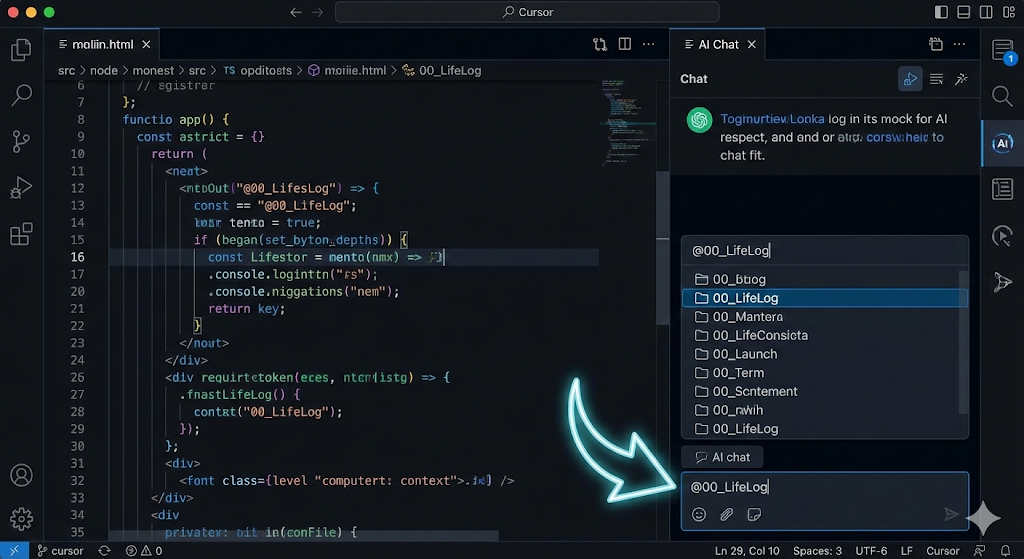 こうすることで、AIは「このフォルダに入っている数百のファイル全て」をあなたの脳内データとして認識します。 ChatGPTのWeb版にちまちまコピペする必要はありません。この「全ファイル一括読み込み」こそがCursorを使う最大のメリットです。