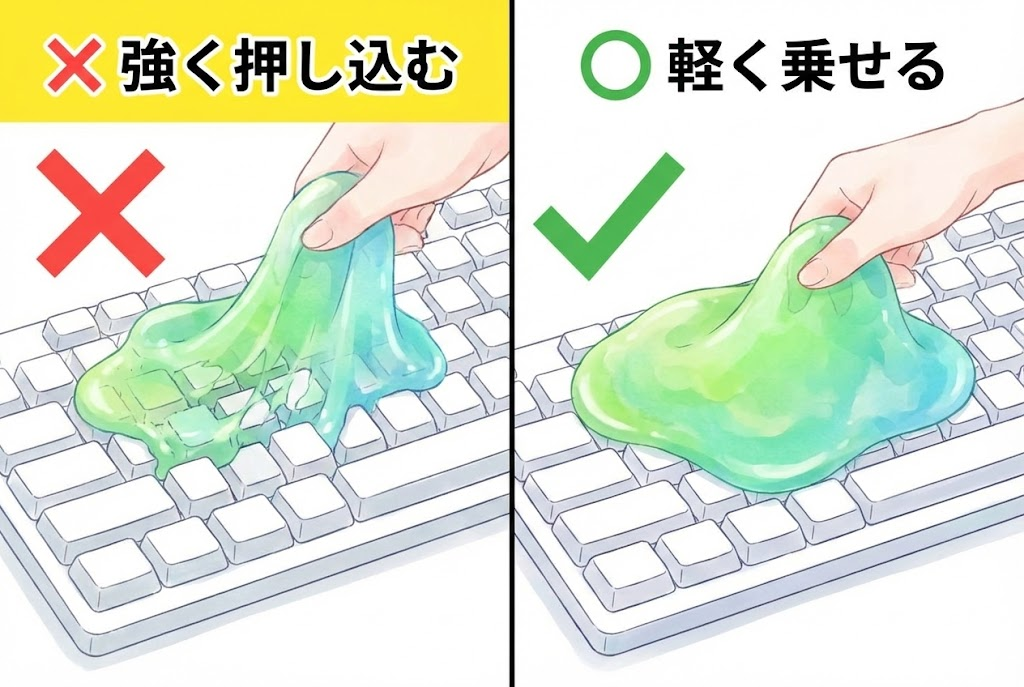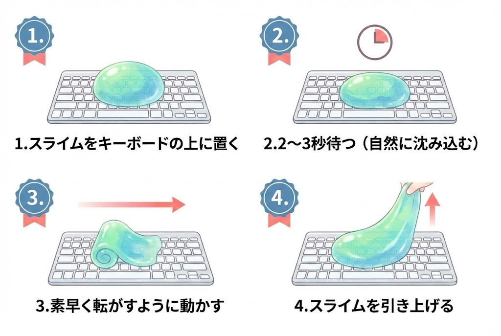 ゆっくり動かすと、スライムがキーの隙間に深く入り込みすぎて、取り出しにくくなります。