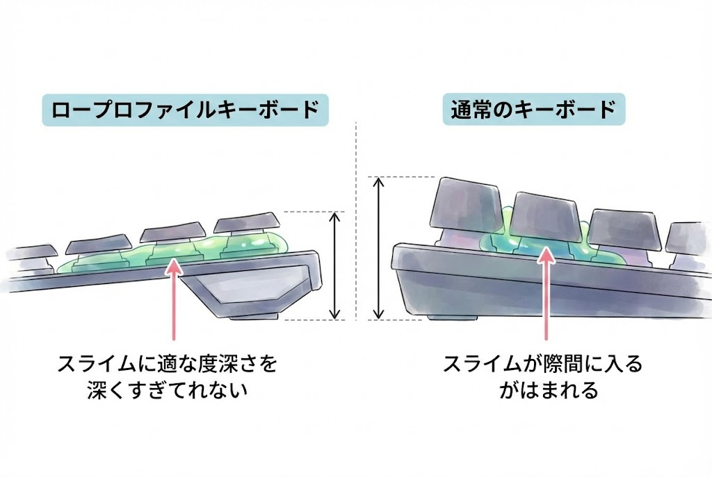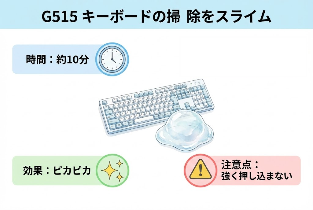 特に、G515のようなロープロファイルキーボードは、スライムが奥まで入り込みすぎないので、初心者でも安心して使えます。