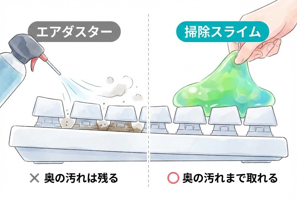 - エアダスターでは取れない汚れも、スライムなら簡単に取れる